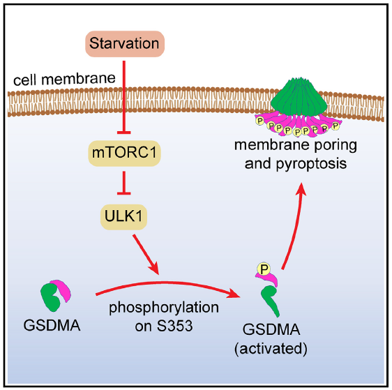 图1. GSDMA在细胞长时间饥饿条件下可被活化的ULK1激酶磷酸化其353位点的丝氨酸,