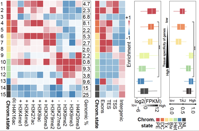 图2. 染色质状态的定义:通过不同的组蛋白修饰以及它们的组合,作者将整个基因组划分成 15 种,7 大类不同的染色质修饰状态。分别对应与启动子/增强子(红色)、剂量补偿(橙色)、转录活跃(黄色)、 二价(bivalent,浅绿),组成型异染色质(深绿),以及 polycomb异染色质(蓝色)和没有任何组蛋白修饰(黑色)。不同的染色质状态对应不同的基因组区域(如基因区,启动子,重复序列等等)和不同的基因表达模式(如广泛或者特异表达)