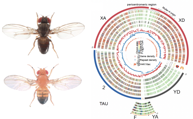 黑腹果蝇D. melanogaster 是经典的实验室遗传模式物种,从摩尔根时代起至今在几乎每一个生物学领域仍然扮演着举足轻重的角色,也是2000 年第一个被测定的昆虫基因组。鲜有人知的是 另一个与 D. melanogaster 在超过五千万年前就分化的果蝇D. pseudoobscura。上个世纪30 年代著名演化遗传学家杜布赞斯基发现该果蝇野外群体里有大量的染色体大片段重排(基因组时代称为“结构变异”),并且随着四季更替会发生重排频率的改变。这些前基因组时代的发现的丰富染色体差异使得 D. pseudoobscura成为演化生物学的重要研究模式物种,基于它形成了一系列染色体重排导致物种形成,超基因(Supergene),减数分裂基因驱动(sex-ratio meiotic drive)等影响深远的理论或概念。因此, 早在 2005 年 D. pseudoobscura成为第二个被测序的果蝇基因组,并经常与D. melanogaster一起成为比较基因组学的研究范式。