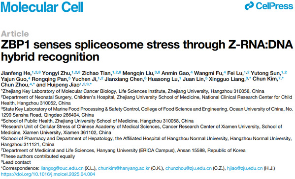 2025年4月22日,我院焦会朋实验室在Molecular Cell上发表文章“ZBP1 senses spliceosome stress through Z-RNA:DNA hybrids recognition”。该研究发现剪接体是调控内源性Z-RNA:DNA积累的关键检查点,并揭示了ZBP1感知剪接体功能失调诱导细胞凋亡和坏死性凋亡的分子机制。