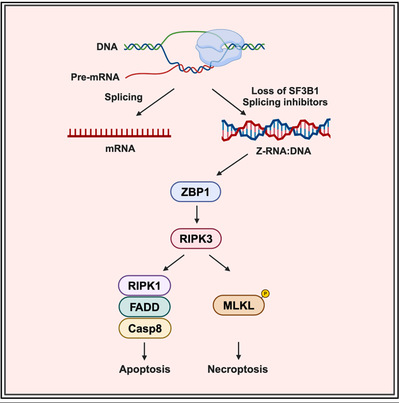 综上所述,本研究从细胞生物学和分子生物学多个层面证实,当剪接体功能受抑制时,细胞内的RNA:DNA杂合链能够呈现左旋构象并激活ZBP1介导的细胞死亡通路。这一发现揭示了RNA:DNA杂合链可作为ZBP1的新型配体诱发细胞死亡,该机制可能与RNA:DNA异常积累相关的疾病有关。
