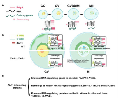 图3:工作模式图。A:聚腺苷酸化状态变化主导母源转录组动态变化。B:ZAR1通过结合mRNAs以调控其稳定性。C:ZAR1与其他蛋白相互作用以调控母源转录组的稳定性和聚腺苷酸化。