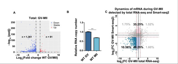 图1:用Total RNA-seq检测母源mRNA动态变化。A:Total RNA-seq检测到的差异基因,MⅡ时期各基因表达水平除以GV时期的表达水平,阈值为Fold change < 0.5或> 2,padj < 0.01。B:ERCC%计算得到的GV和MⅡ时期卵母细胞间的相对RNA拷贝数。C:联合分析Total RNA-seq和Smart-seq2检测的母源转录组动态变化。