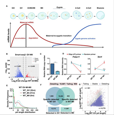 图2:用Smart-seq2和PAIso-seq2检测母源mRNA的动态变化。A:母源转录组动态变化示意图。B:Smart-seq2 检测到的差异基因[3],阈值同图1。C:ERCC%计算得到的GV和MⅡ时期卵母细胞间的相对RNA拷贝数。D:RT-qPCR验证Oligo-d(T)引物和Random引物对GV和MⅡ时期卵母细胞内RNA的逆转录效率。E:PAIso-seq2检测到的各时期卵母细胞中的转录本Poly (A)尾长度分布。F、G:母源转录组差异聚腺苷酸化状态分析。