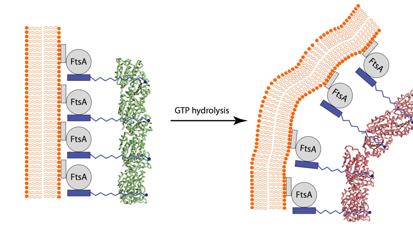FtsZ is a guanosine triphosphatase (GTPase) that polymerizes into protofilaments at the bacterial division site. These protofilaments further organize to a structure termed the Z ring. Z ring recruits the accessory division proteins to the septum and also provides mechanical forces needed to constrict the membrane and reduce the cell width. However, how Z ring generates mechanical force is unclear. While one popular model suggests that mechanical forces are generated by means of a change in FtsZ structure induced by guanosine triphosphate (GTP) hydrolysis, nucleotide-dependent conformational transitions have yet to be observed in FtsZ monomer structures. Such transitions may be a feature of FtsZ only in its native protofilament-forming state. Researchers from Zhejiang University of China sought to resolve this question by obtaining high-resolution structures of guanosine diphosphate (GDP)–bound Mycobacterium tuberculosis FtsZ (MtbFtsZ) filaments. The results suggest a complex and dynamic FtsZ protofilament network with a high degree of plasticity that is capable of generating forces to drive cytokinesis, during cycles of hydrolysis, while maintaining the structural integrity of individual monomers.