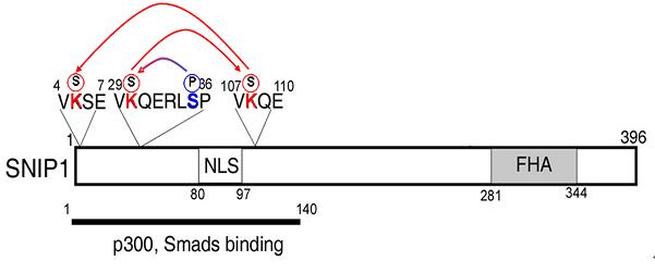 Smad nuclear interacting protein-1 (SNIP1) is one of the transcription repressors that inhibit TGF-beta signaling through disrupting the transcriptional activator complex of Smads, the central mediator of TGF-beta signaling, and its interaction with transcription co-activator p300. However, how SNIP1 activity is regulated remains enigmatic.