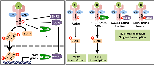 TGF-β and related growth factors critically regulate cell potency and functions. Smad7 is a negative feedback product of TGF-β superfamily signaling and fine-tunes a plethora of pleiotropic responses induced by TGF-β ligands. However, its non-canonical functions independent of TGF-β signaling remain to be elucidated. In this study, Dr. Feng’s group reported that Smad7 activates STAT3 signaling in maintaining mouse embryonic stem cell (ESC) pluripotency in a manner independent of the TGF-β signaling pathway yet dependent of the LIF co-receptor gp130. Smad7 directly binds to the intracellular signaling domain of gp130 and disrupts the SHP2-gp130 or SOCS3-gp130 complex, thereby amplifying STAT3 activation. Consequently, Smad7 facilitates LIF-mediated self-renewal of mouse ESC and is also critical for induced pluripotent stem cell (iPSC) reprogramming. This finding illustrates an uncovered role of the Smad7-STAT3 interplay in maintaining cell pluripotency, and also implicates a mechanism involving Smad7 underlying cytokine-dependent regulation of cancer and inflammation.