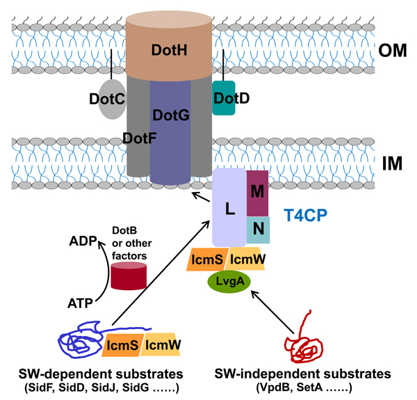 Figure. The molecular mechanism and the dual roles of IcmS-IcmW in the type IVb secretion system of Legionella pneumophila