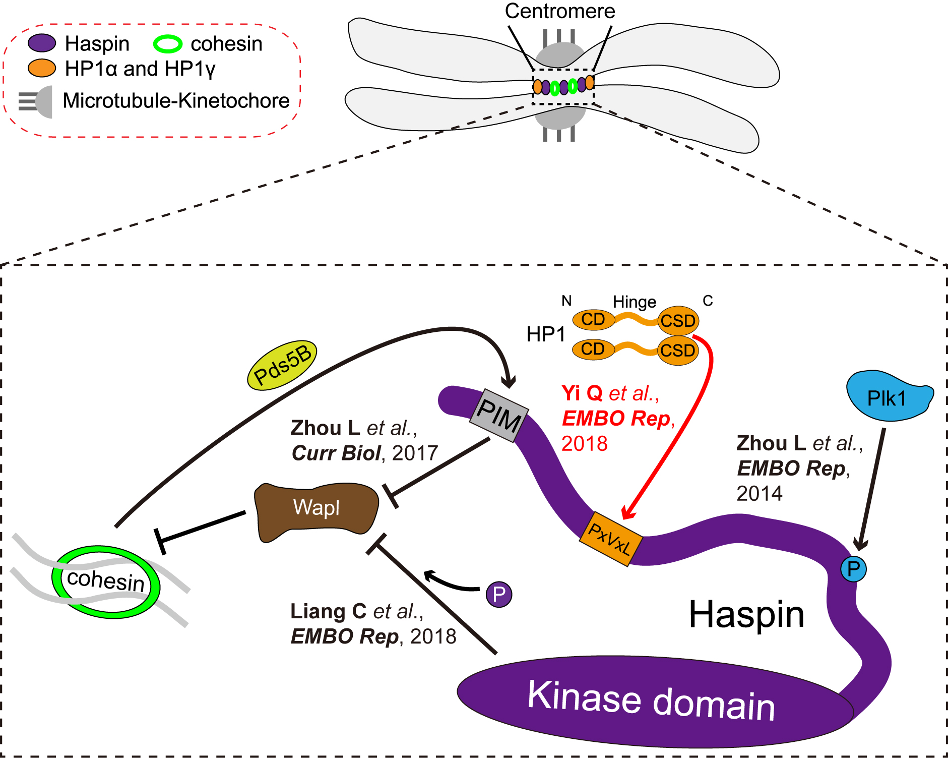 In this study, Professor Fangwei Wang and his students show that double knockout (DKO) of HP1α and HP1γ causes defective mitosis progression and weakened centromeric cohesion. While mutating the chromoshadow domain (CSD) prevents HP1α from protecting sister-chromatid cohesion, centromeric targeting of HP1α CSD alone is sufficient to rescue the cohesion defects in HP1 DKO cells. Interestingly, HP1-dependent cohesion protection requires Haspin, an antagonist of the cohesin-releasing factor Wapl. Moreover, HP1α CSD directly binds the N-terminal region of Haspin and facilitates its centromeric localization. The need for HP1 in cohesion protection can be bypassed by centromeric targeting of Haspin or inhibiting Wapl activity. Taken together, these results reveal a redundant role for HP1α and HP1γ in the protection of centromeric cohesion through promoting Haspin localization at mitotic centromeres in mammals.