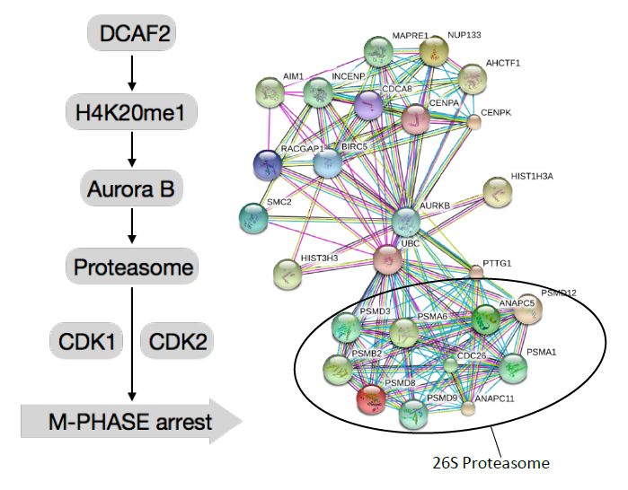 Figure1,DCAF2 restricts H4K20me1 modifications at Aurk promoter loci in activated T cells during the M phase, which regulates 26S proteasome activity, suggested that Dcaf2 deficiency causes M phase arrest through proteasome-dependent mechanisms in peripheral T cells.