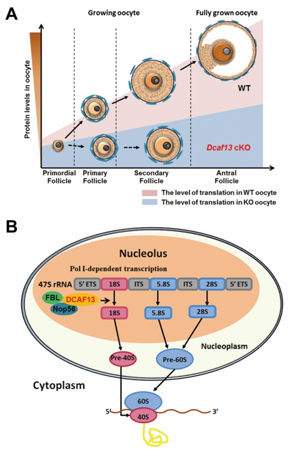 A: Duringfollicle development, growing oocytes undergo a translationally active growing phase in which necessary protein are synthesized. DCAF13 deletion in oocytes compromised nucleolus NSN-SN configuration transition and caused global down-regulation of protein accumulation, whichcause follicular development arrest in early secondary follicles.