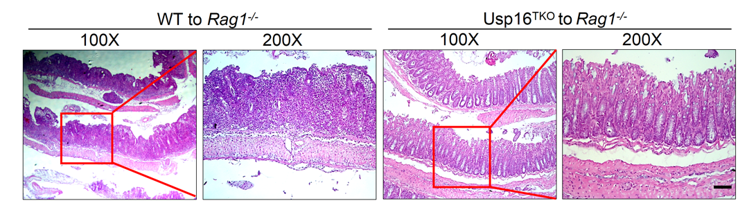 It shows that USP16 deficiency attenuates T cell-mediated autoimmune diseases, USP16TKO mice exhibited a significantly delayed onset of experimental autoimmune encephalomyelitis (EAE), demonstrated by the assessment of EAE clinical scoresand a substantially reduced level of central nervous system infiltration. The transfer of naïve CD45RBhi CD4+ T cells from USP16TKO mice into Rag1-/- mice did not induce body weight loss or inflammation-triggered death to the same extent as in WT controls or epithelial denudation.