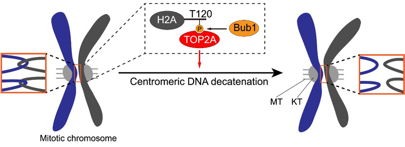Model for the role of Bub1-mediated H2ApT120 in recruiting TOP2A to mitotic centromeres to decatenate sister DNAs.