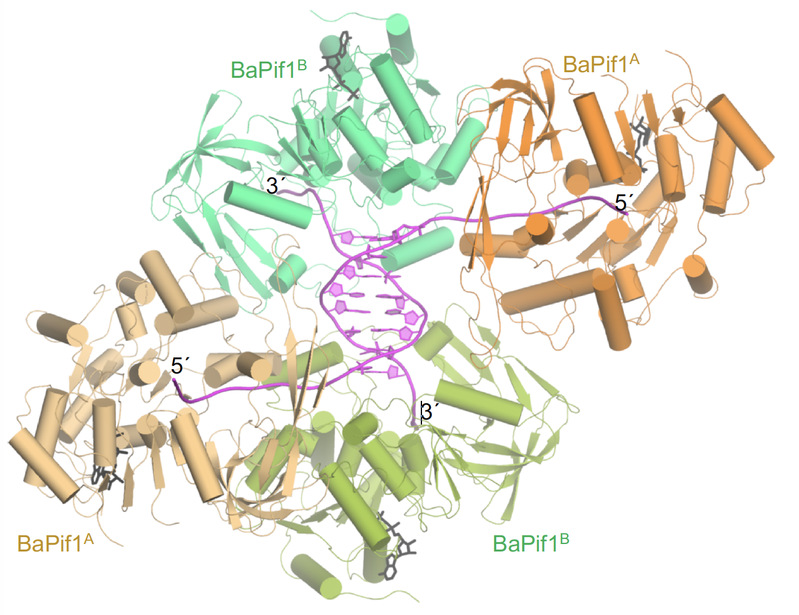 Pif1 is the member of superfamily 1B(SF1B) helicase, evolutionarily conserved from prokaryote to eukaryote. Pif1 can unwind dsDNA,DNA/RNA hybrid and G-quadruplex DNA with 5’-3’ polarity by using the energy provided by ATP hydrolysis. Pif1 plays multiple roles in maintaining genome stability and preferentially unwinds forked dsDNA, but the mechanism by which Pif1 unwinds forked dsDNA remains elusive. Haiwei Song’s lab took BaPif1 as the research object, solved the crystal structure of BaPif1 and symmetrical double forked dsDNA complex using structural biology method. Two interacting BaPif1 molecules are bound to each fork of the partially unwound dsDNA, and interact with the 5′ arm and 3′ ss/dsDNA respectively. The structure revealed several important features that distinguish BaPif1 from any other known SF1 and SF2 helicases. First, the BaPif1 molecule bound to the 5′ arm initiates the forked DNA unwinding by breaking the first base-pair through geometrical strain while the BaPif1 molecule bound to the 3′ arm plays an accessory role in unwinding through stabilizing the first broken base-pair and engaging the second base-pair in a pre-breaking state. Second, the BaPif1 molecule bound to the 3′ arm is positioned to prevent re-winding of the displaced strand with the tracking strand. Third, the two BaPif1 molecules contact each other through electrostatic interactions, and the nature of such interactions may allow two BaPif1 molecules regulate their unwinding activities. These observations together with kinetics and smFRET data enabled us to propose a mechanism by which BaPif1 unwinds a forked dsDNA. These results not only explain the previous biochemical observations but also provided a framework for further elucidating the mechanism by which Pif1 helicases unwind DNA/RNA hybrids and G4 DNAs.