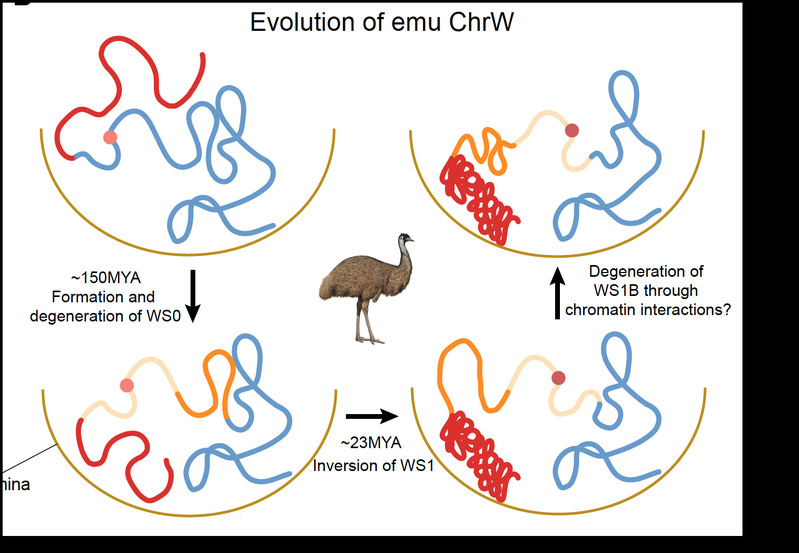 The two other studies about avian sex chromosomes also exhibit a completely distinct pattern of sex chromosome evolution from that of mammals. The sex chromosomes of the Australian emu and the Peking duck, two widely domesticated poultry species, represent the early and middle stages of avian sex chromosome evolution, respectively, whereas the sex chromosomes of species such as humans, chicken, and Drosophila represent the terminal stage of evolution, when the sequences of the X and Y chromosomes or, in birds, the Z and W chromosomes are fully differentiated. The newly assembled genome sequence of the emu revealed that its sex chromosomes differ little from their ancient autosomal ancestors, with more than two-thirds of the regions still maintaining homologous recombination and high sequence similarity, and that a large number of transcriptionally active genes remain even in regions where recombination has been suppressed. Nevertheless, sex chromosomes of emu showed changes in chromosomal 3D configuration and interactions within chromosomal regions, suggesting that the evolution of sex chromosomes, with changes in overall configuration including topologically associated domains, may underlie changes in genome sequences and gene expressions. These findings provide new insights into molecular evidence of sex chromosome degeneration.