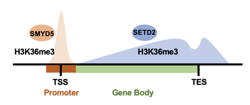 In this study, the authors use the method CUT&Tag to analyze the distribution of H3K36me3 in uncross-linked cells, by which Tn5 transposons were used to cut and label DNA as natural as possible. Surprisingly, H3K36me3 was found deposited onto chromatin at the gene promoters for the first time. This enrichment has also been validated in native H3K36me3 ChIP-seq without sonication. Through a targeted gene screening, SMYD5 was identified as a methyltransferase to catalyze the methylation of H3K36me3 in vivo and in vitro.