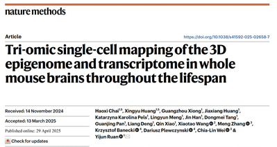 [2] Chai, H., Huang, X., Xiong, G. et al. Tri-omic single-cell mapping of the 3D epigenome and transcriptome in whole mouse brains throughout the lifespan. Nat Methods (2025). https://doi.org/10.1038/s41592-025-02658-7