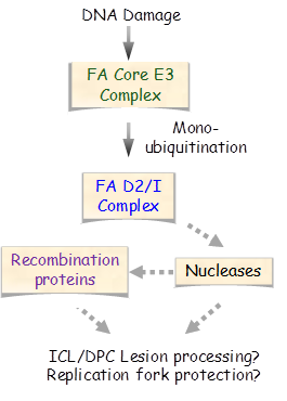 范可尼贫血症(Fanconi anemia, FA)的临床症状包括渐进性贫血, 渐进性骨髓衰竭,染色体异常和极强的肿瘤易感性。FA患者细胞的特征则反映DNA交联损伤修复能力的严重缺陷。范可尼贫血患者的细胞对DNA交联剂高度敏感,使得这一遗传病成为研究复杂型DNA损伤的主要模型。尽管目前在患者中发现了24种FA基因的遗传缺失与范可尼贫血直接相关,但范可尼贫血通路功能在DNA损伤修复和缓解复制压力的分子机制仍然有待阐明。1. 范可尼贫血途径的遗传框架是什么?2. DNA-蛋白质交联(DPC)损伤是否范可尼贫血症的致病损伤?3. 为什么范可尼贫血通路的缺陷会导致独特的全血性贫血和骨髓衰竭表型,而很少涉及其他组织器官?实验室近期的研究项目旨在回答这些问题,并从分子机制上深入了解这一复杂途径如何维护人类基因组的稳定性.